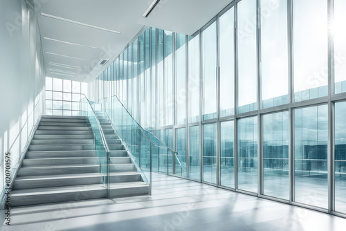 Obraz premium Empty office corridor with glass curtain wall, stair and light from sunlight. Modern building interior background, high key