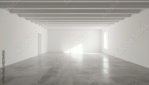 © Khoira Studio, Obraz premium Empty office interior with concrete floor empty white wall with copy space and windows in background.