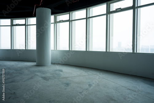 Fototapeta premium Empty office interior with floor-to-ceiling windows, white column, and concrete floor
