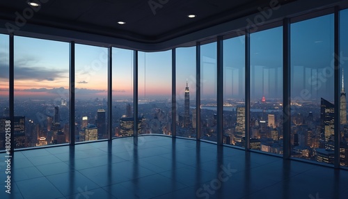© Maryna, Obraz premium Empty office space with large windows overlooking city skyline at dusk. Modern skyscraper view includes lights and buildings stretching into horizon. Corporate interior design.