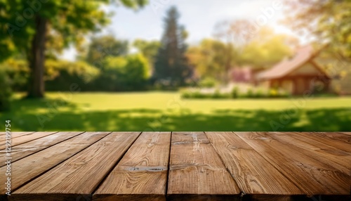 © Stanislava, Fototapeta premium Empty old wooden table background surface with blurred green yard background. Empty table mockup for products