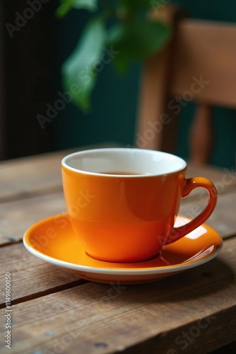 © ทรัพย์ทวี แก้วไพฑูรย, Obraz premium Empty orange cup and saucer on a rustic wooden table, empty, orange, cup