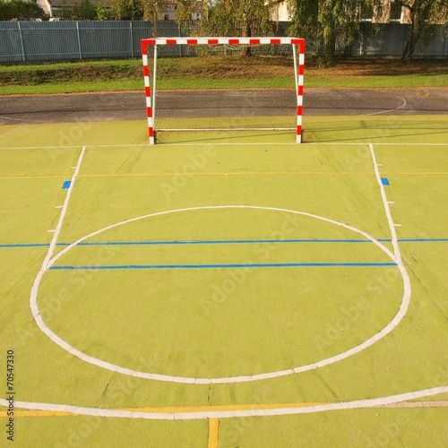 Obraz premium Empty outdoor handball playground, plastic light green surface