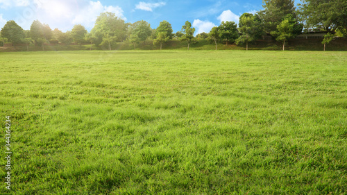Obraz premium empty park with green grass field and tree in sunshine morning, nobody...