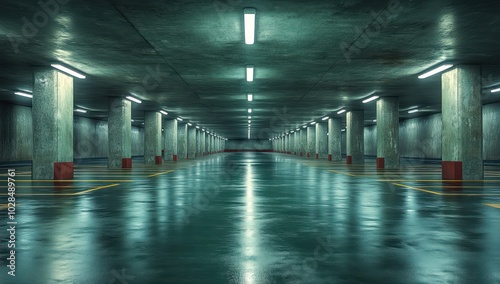© tydeline, Fototapeta premium Empty Parking Garage with Wet Floor