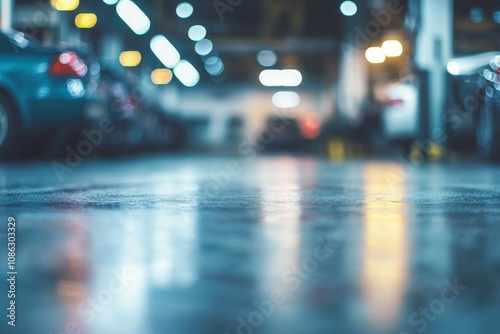 © tolem929, Fototapeta premium Empty parking lot floor with blurred cars and lights in the background.