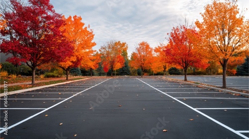 © Generative AI, Obraz premium Empty Parking Lot Surrounded by Vibrant Autumn Trees on a Cloudy Day, Featuring Vivid Colors