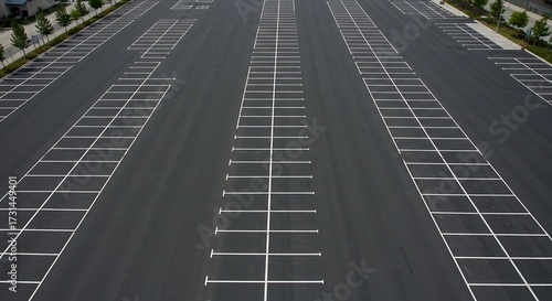 Fototapeta premium Empty parking lot with white lines from aerial perspective