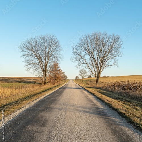 © Murda, Fototapeta premium Empty paved road leads through field with trees.