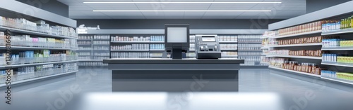 Obraz premium Empty pharmacy interior with shelves and checkout.
