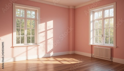 © Ayahe Stock, Obraz premium Empty pink room with a window and wooden floor in a classic interior design