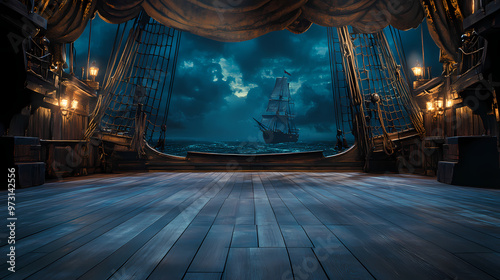 © Thiago, Fototapeta premium Empty pirate ship deck background for theater stage scene. Pirate Ship. Illustration