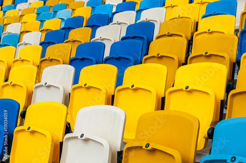 © bychykhin, Naklejka premium Empty plastic seats in a footbal or soccer stadium. 2016 sport background