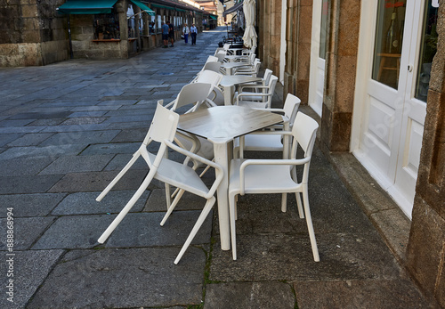 © Javi, Naklejka premium empty plastic tables and chairs on the street next to the closed bar