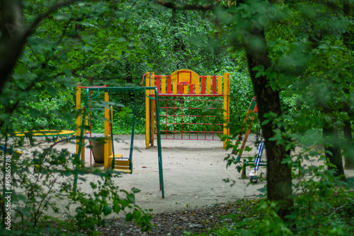 Fototapeta premium Empty playground in the park. Unused children's entertainment devices.