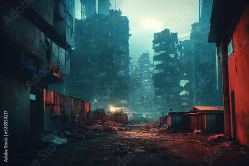 Obraz premium Empty post apocalyptic city landscape. Digital painting of building in ruins, destroyed. Futuristic slum. Broken, deserted cityscape. Post-war scenery, abandoned house. Digital painting of demolition.