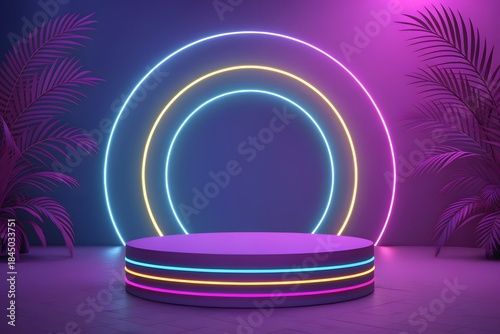 Obraz premium Empty purple neon podium with glowing circles and tropical plants in a...
