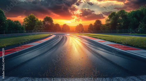 Naklejka premium Empty race track and green woods nature landscape at sunset, Bright color....