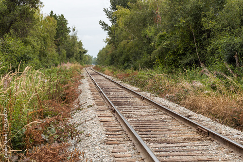 © Yi, Fototapeta premium empty railroad in the countryside with dense grasses and green trees on both side on an overcast day