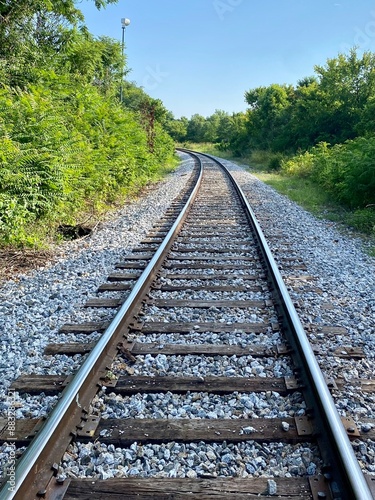 © Melissa Burovac, Fototapeta premium Empty railroad tracks through trees in the country