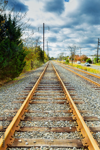 Fototapeta premium empty railway in autumn day with fallen leaves
