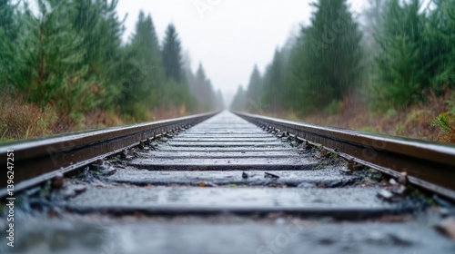 Fototapeta premium Empty railway track leading into a misty forest