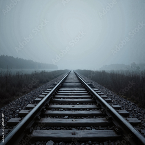Obraz premium Empty railway track stretching under gray sky, soft diffused light