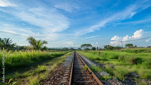 Fototapeta premium Empty railway track under blue sky through nature in Indonesia background concept : Generative AI