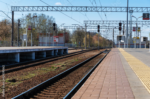 Fototapeta premium Empty railways and railway station, perspective of rails in line, ready for train arriving, railroad infrastructure.