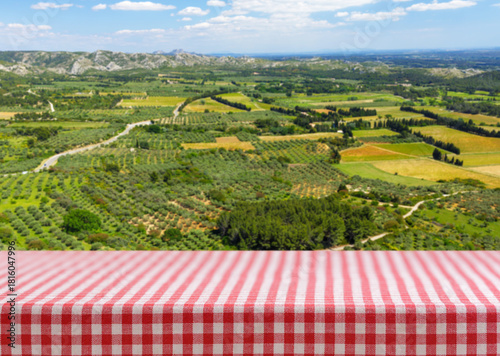 © Nitr, Naklejka premium Empty red and white checkered tablecloth for picnic and rural landscape of colorful fields, farmlands, meadows