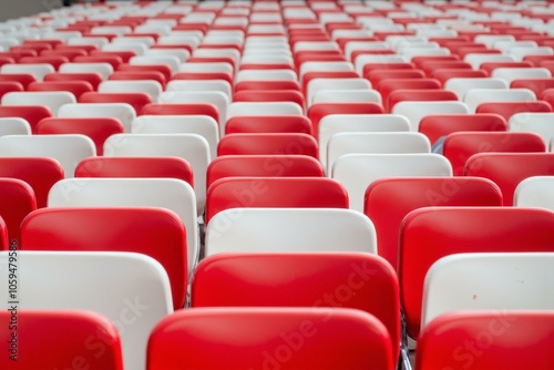 Naklejka premium Empty Red and White Stadium Seats Convey A Sense of Anticipation and...