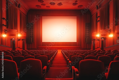© MdAli, Fototapeta premium Empty Red Cinema Auditorium with Big Screen, Classic Movie Theater Interior
