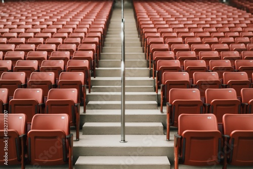 Fototapeta premium Empty red stadium seats with central stairway in symmetrical pattern under...