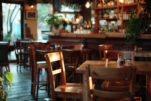 © CojanAI, Obraz premium Empty restaurant interior with wooden tables and chairs