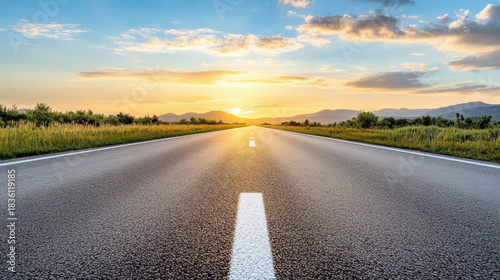 © siraphol, Naklejka premium Empty road at sunrise leading toward distant hills with warm glowing sky