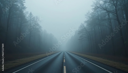 © firman, Fototapeta premium Empty road disappearing into foggy forest