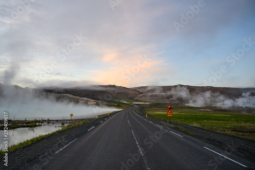 © ilyaska, Fototapeta premium Empty road in Iceland at Hverir geothermal area with hot steam during sunset