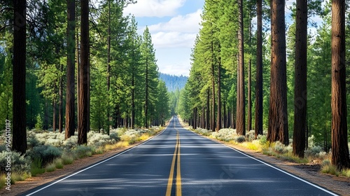 Fototapeta premium Empty road lined with towering pine trees, peaceful and isolated
