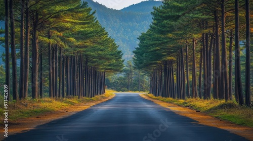 © Katavudh, Obraz premium Empty road lined with towering pine trees, peaceful and isolated