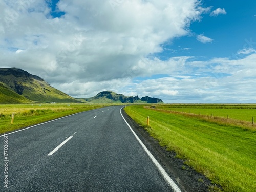 © rocklights, Fototapeta premium Empty road surrounded by green meadows im the south of Iceland
