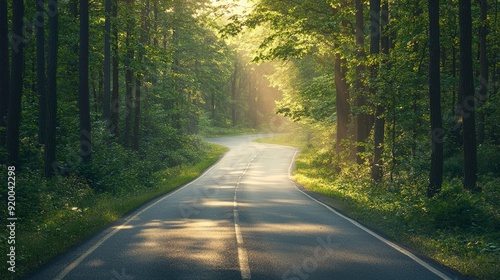 © Watasiwa, Fototapeta premium Empty road through a forest with sunrays breaking through trees