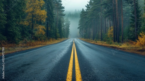 © Andre Jovi, Obraz premium Empty Road Through a Misty Forest with Yellow Lines