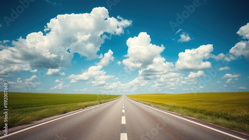 © Sandra, Fototapeta premium Empty Road Through Green Fields - Breathtaking Sky Landscape