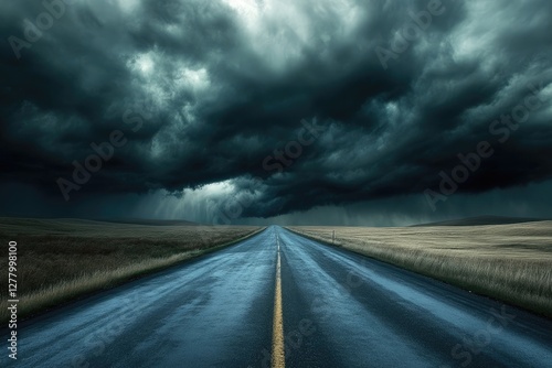 © Abuabdurrahman, Fototapeta premium Empty Road Under Stormy Sky, Heading Into Darkness
