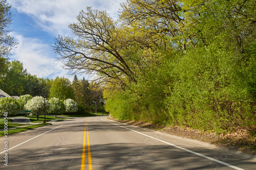 © Jill Greer, Fototapeta premium Empty road with double yellow line on a beautiful spring day in May