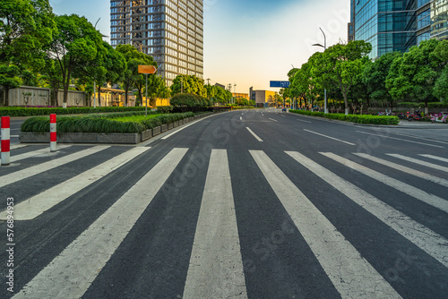 © hallojulie, Obraz premium empty road with zebra crossing and skyscrapers in modern city.