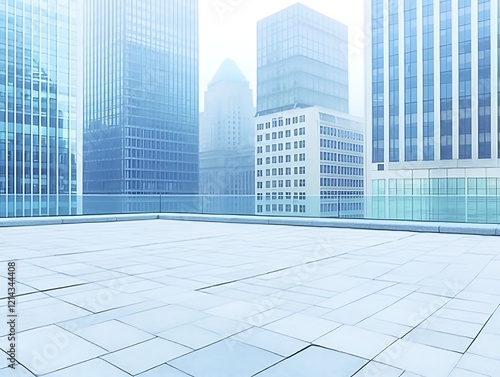 © Tini, Fototapeta premium Empty rooftop plaza overlooking hazy cityscape.
