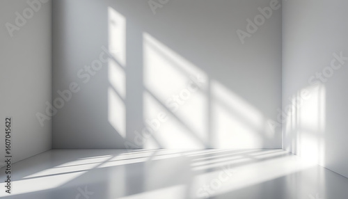 © MI Sumon, Fototapeta premium Empty room corner with sunlight shadow overlay on white wall and floor, minimalist interior design background