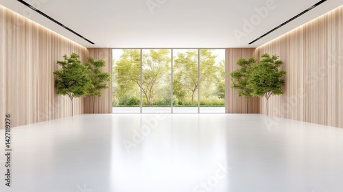 Fototapeta premium Empty Room Two Potted Trees Minimalist Style High-Resolution Lighting Wide Angle View Bright Sunlight Tranquil Scene Lush Green Garden Neutral Calming Tones Interior Design Inspiration