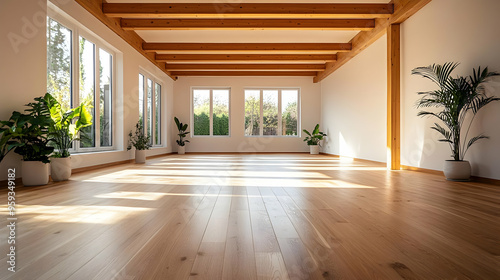 © Siasart Studio, Fototapeta premium Empty room with hardwood floors and large windows, wooden beams, and sunlight streaming in.